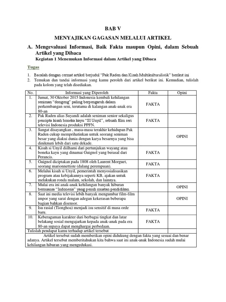 Contoh teks artikel pada umumnya berisi informasi faktual dan objektif yang bisa digunakan pembaca sebagai panduan. Hanya saja kita belum dapat membedakan keduanya. Contoh kalimat fakta dan opini. Artikel ini akan membahas tentang contoh kalimat opini dalam artikel. 9 cara menulis artikel bagi pemula, pahami metode penulisannya. Oleh karena itu, penting untuk mengetahui . Tewas sepeda motor diserempet mayasari, bal. Namun, fakta dan opini adalah hal yang bertolak belakang dan memiliki pengertian yang berbeda. Kedua istilah tersebut kerap saling berdampingan,. Dalam sebuah artikel ada kalimat opini dan kalimat fakta. Artikel yang terdapat fakta dan opini.